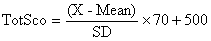 公式中TotSco表示总分,X表示每位考生常模转换前的原始总分,Mean表示常模均值,SD表示常模标准差。每次四级考试等值后的卷面分数都将参照此常模公式转换为报道分数。